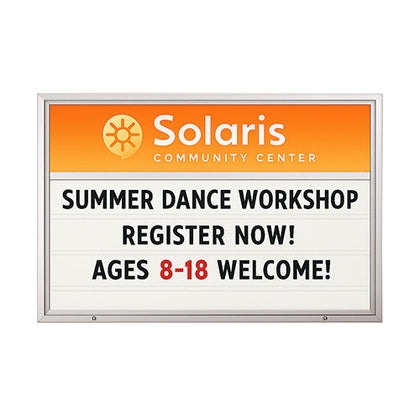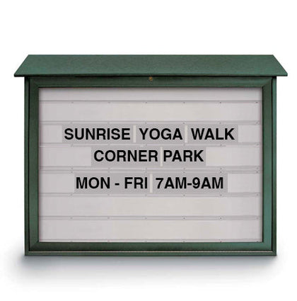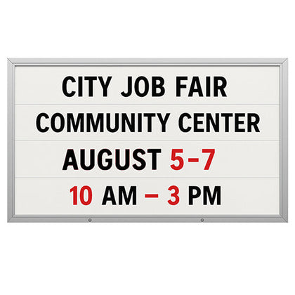 Weep holes on the cabinet bottom help drain away water, and vents help reduce condensation build-up. An aluminum backer with moisture-blocking silicone sealant is installed on the display case—making the changeable marquee sign ideal for active outdoor locations. A translucent white acrylic copy board with plastic copy rails is installed into the cabinet. These rails hold changeable 4" or 5" letters, included with your purchase. Additional reader board marquee letters and number sets can be purchased.