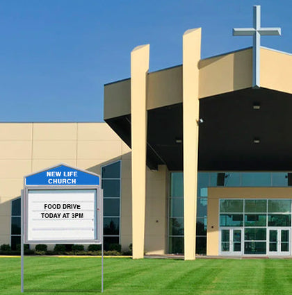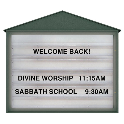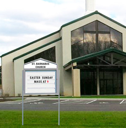 Catch everyone's attention with the uniquely pointed header reader board. This attractive cathedral-style reader board will stand out at any place of worship. Choose your church marquee board style for installing onto an exterior wall or insetting into a building. The external standing cathedral marquee reader board comes with two posts.