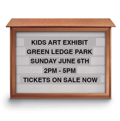 The reader board cabinet is made of aluminum and is built to withstand everyday outside elements. Aside from standard side hinge display cases, some models feature a full-length piano hinge on the door's top side with two front CAM locks on the bottom of the cabinet. The door swings upward and is held in place with prop arms while updating your message. The cabinets also feature a break-resistant, polycarbonate acrylic window for added protection.