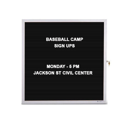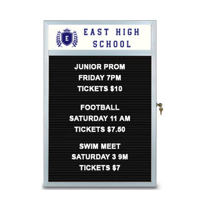 Super Slim "SwingCase" Single Door Indoor Enclosed Radius Edge Letter Boards features a 5" header panel that can present your company, church, school, community, business, and organization name, your team, event, or any other announcement. It's your message text to create.